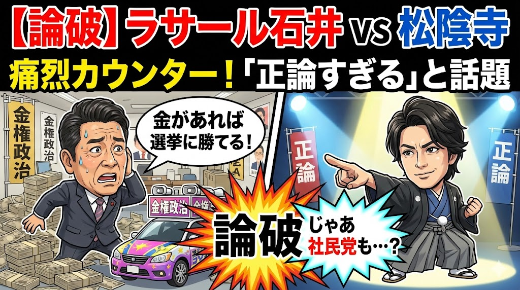 選挙における「資金力」の影響力を強調した石井氏に対し、松陰寺氏が放った「ある党」を例に出したカウンターが、的確すぎると話題になっています。